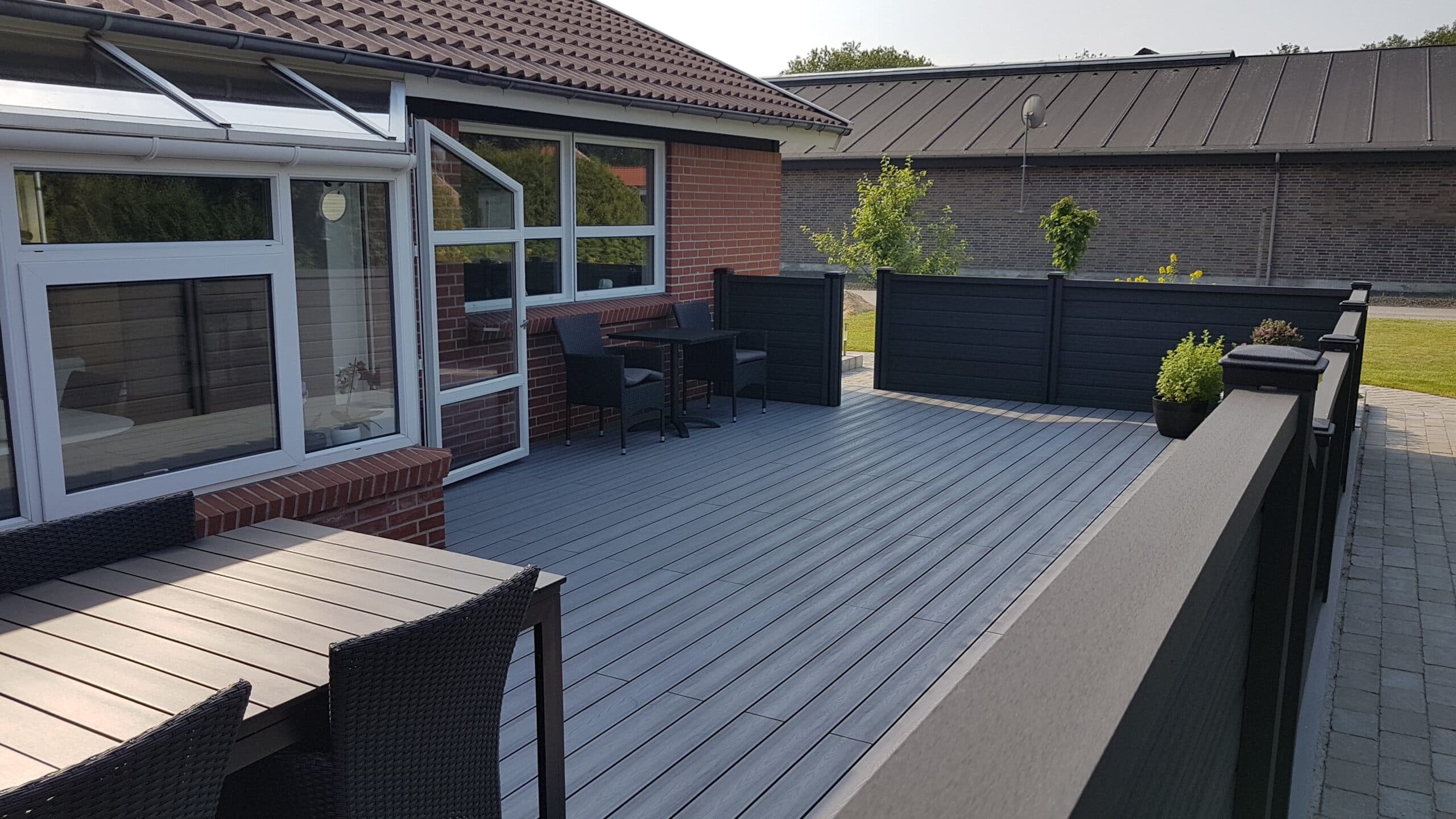 Kompositterrasse i farven betongrå og komposithegn i farven gråsort med træstruktur.