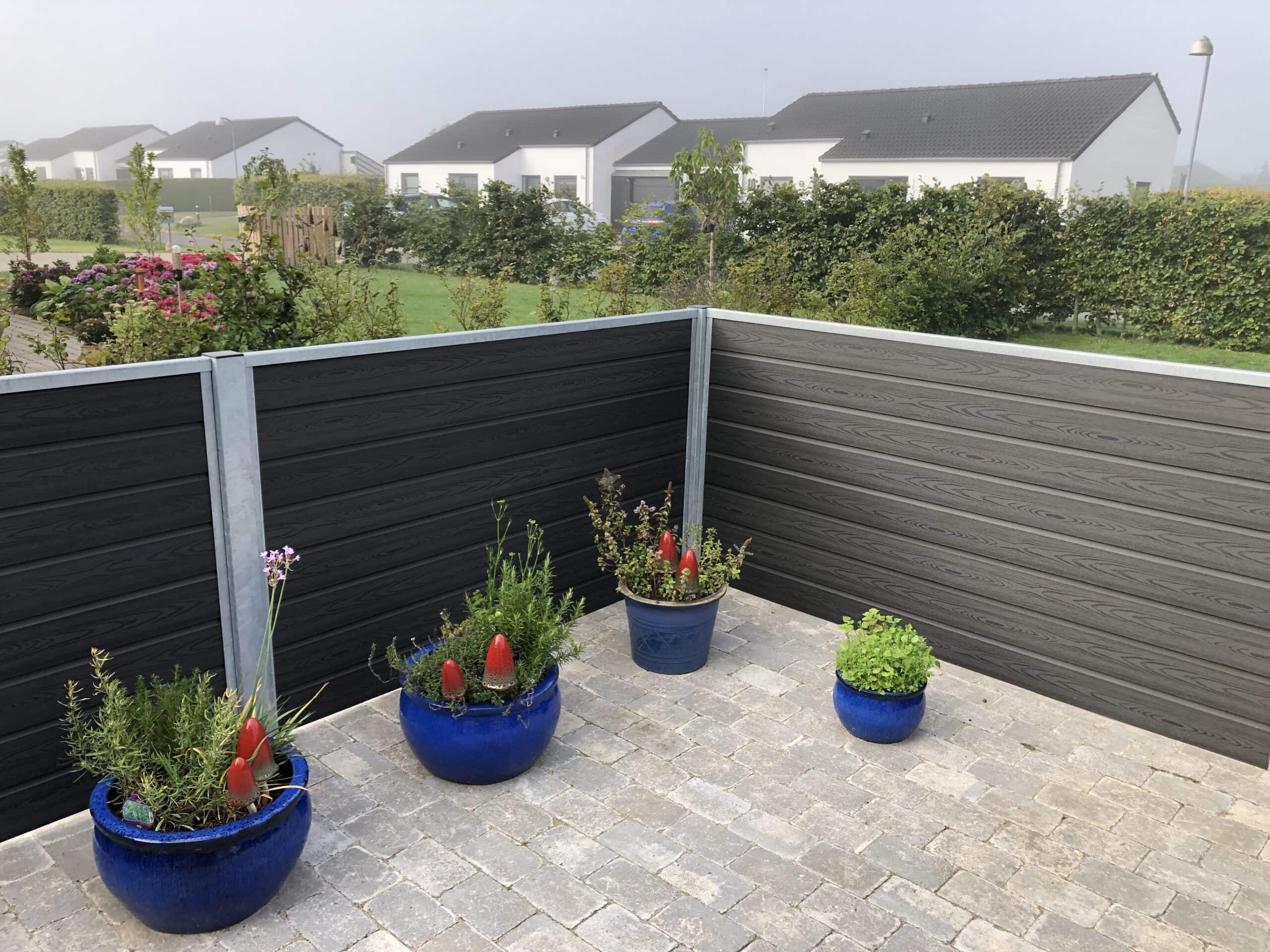 Vedligeholdelsesfrit hegn i komposit og varmgalvaniseret stål.