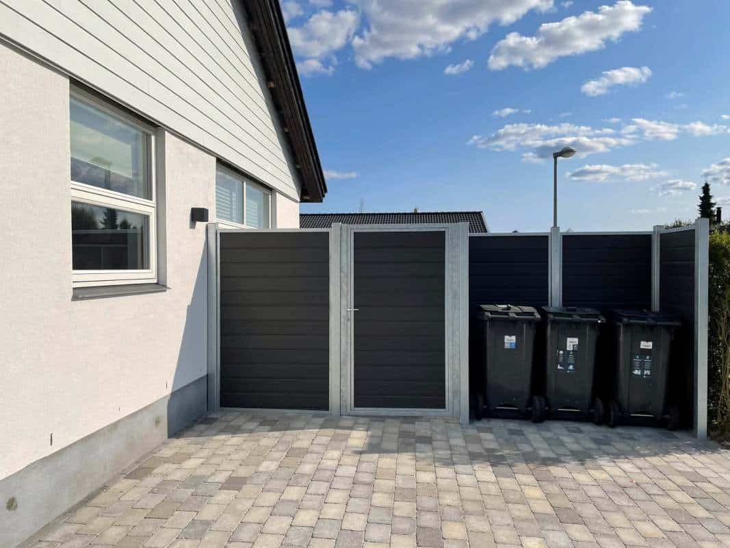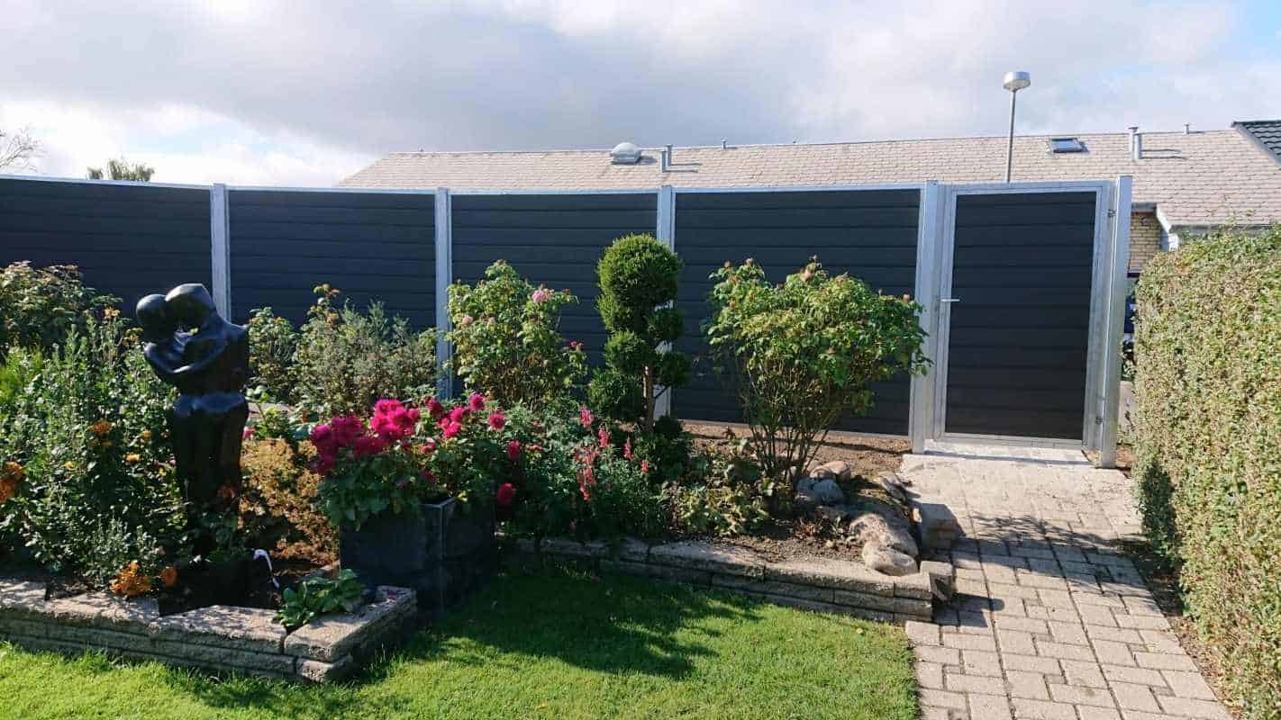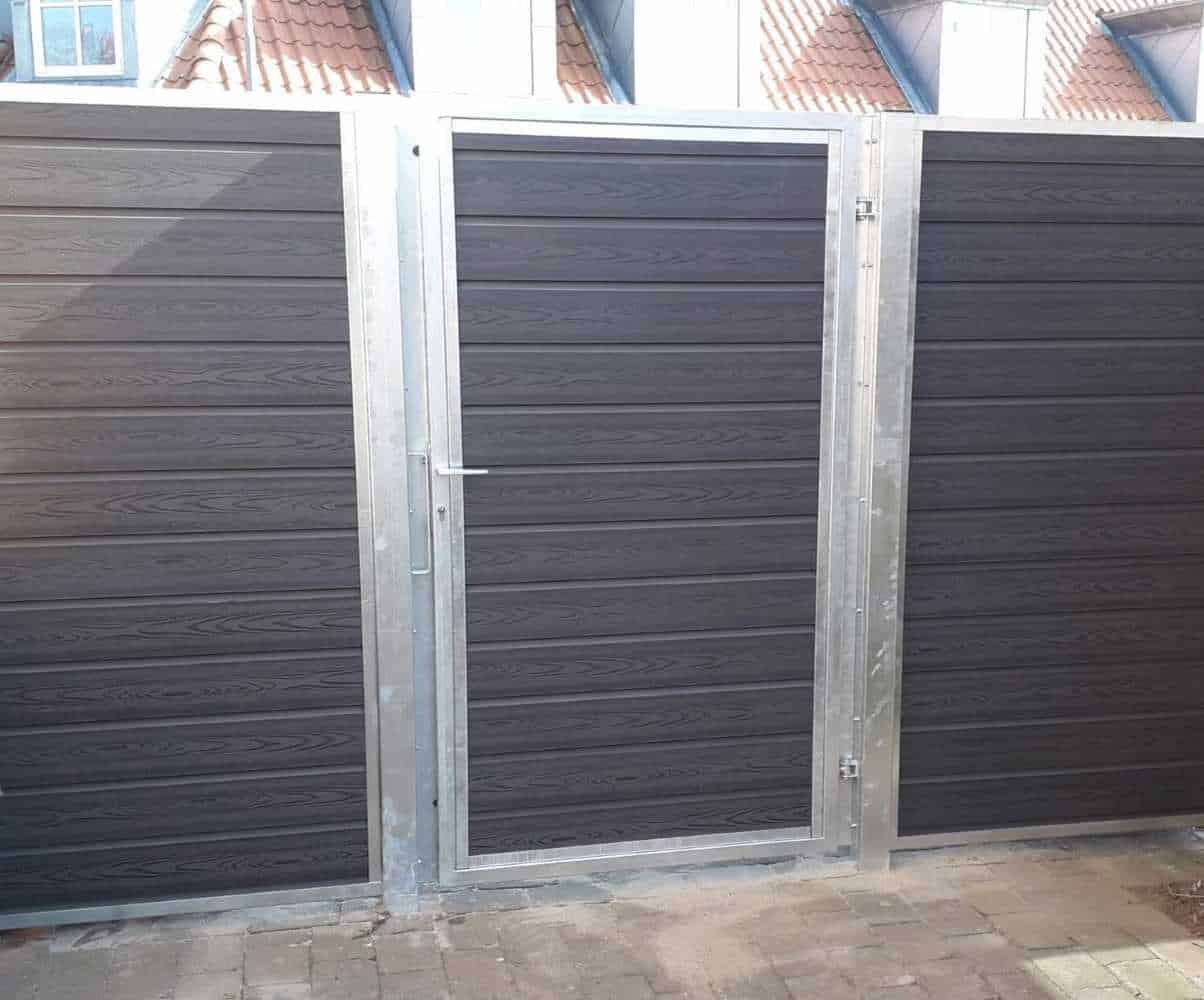 Hegnslåge i varmgalvaniseret stål H210 x B100 cm med gråsort træstruktur komposit.