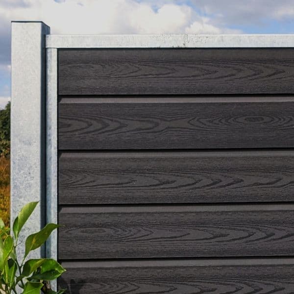 Komposit hegn, varmgalvaniseret stål med gråsort træstruktur komposit. Startfag højde 182 cm x bredde 107,5 cm.